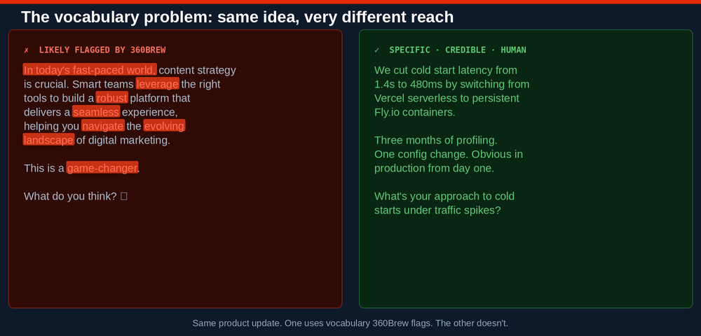 Lack of specificity. Claims without numbers, tools, or named examples read as generic. "We improved performance significantly" is AI-coded. "We cut cold start latency from 1.4s to 480ms by moving to persistent containers" is human-coded. The more specific your content, the further it travels.
