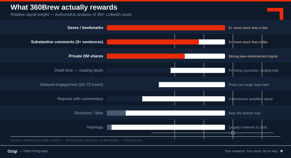 The data is unusually consistent across sources. Richard van der Blom's analysis of 1.8 million posts, AuthoredUp's three million, and Ocean Labs' research all point to the same ranking hierarchy. The strongest signals, in order of weight: Saves. When someone bookmarks your post, 360Brew interprets it as a strong signal that your content has lasting value. AuthoredUp's data shows saves drive 5x more reach than a like and 2x more than a comment. LinkedIn added Saves and Sends to post analytics in late 2025 specifically because they matter more now.