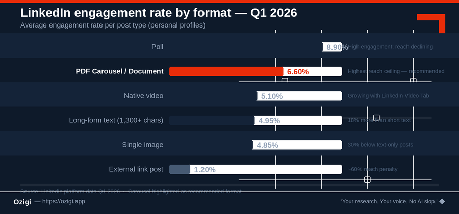 Format matters more than it used to because 360Brew uses format as a dwell-time signal. Based on Q1 2026 engagement data, the hierarchy is clear: